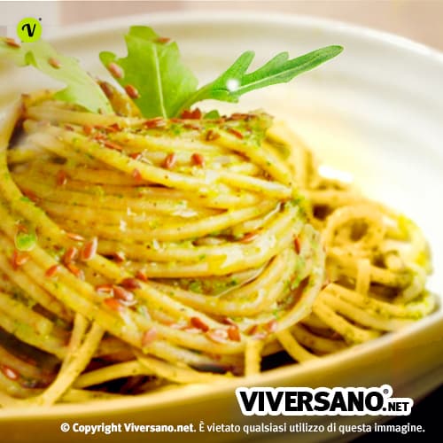 Un’idea davvero originale è quella di rendere i semi di lino protagonisti di un buon primo, a tal proposito provate il pesto di rucola e semi di lino! Per prepararlo occorre tritare grossolanamente un pugnetto di mandorle con aglio e 1 cucchiaio di semi di lino, aggiungete poi la rucola, l’olio d’oliva, qualche goccia di succo di limone e un pizzico di sale, e tritate per qualche secondo. In pochi minuti otterrete un pesto buono, sano e alternativo che, grazie alla viscosità dei semi di lino, si avvolgerà perfettamente alla pasta.