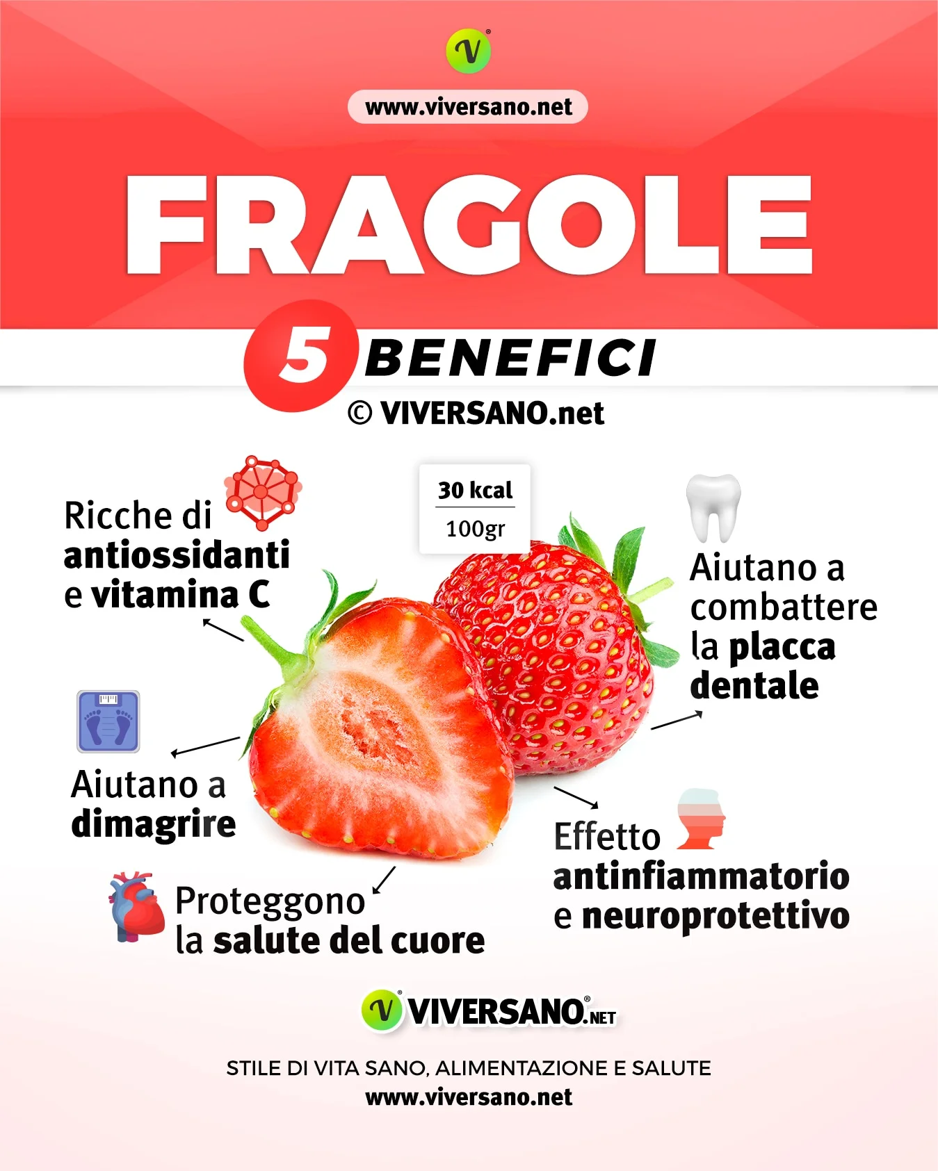 Le fragole hanno poche calorie, solo 30 ogni 100 grammi, ma è una fonte molto ricca di diversi composti nutritivi ed in particolare di zuccheri, vitamine, flavonoidi e antocianine. Questi nutrienti, agendo in maniera sinergica, conferiscono alla fragola proprietà utili a promuovere lo stato di salute e prevenire diverse patologie.