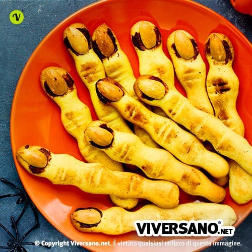 I biscotti che vi proponiamo sono a forma di dita di strega, preparati con farina integrale, ricca di fibre e molto saziante, e farina di mandorle, proteica e ricca di magnesio. L’unghia del dito di strega la faremo con una mandorla tostata e la attaccheremo con una gustosa crema al cioccolato.