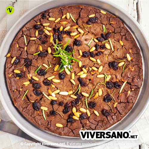 6 Decorate la superficie del dolce con il rosmarino, l’uvetta sultanina e i pinoli avanzati. Se lo desiderate, completate con qualche goccia d’olio extravergine di oliva.