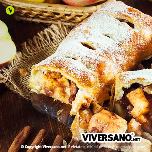 8 Disponete lo strudel sopra una teglia da forno, quindi cuocete in forno già preriscaldato a 180° per 45/50 minuti. Una volta cotto potete aggiungere un po’ di zucchero a velo sulla superficie.