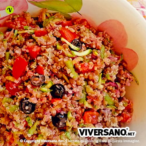 4 Una volta che la quinoa sarà cotta, se fosse rimasta acqua di cottura scolarla altrimenti versarla nella ciotola con le verdure e le lenticchie lessate, condite con olio, pepe e sale all’occorrenza;